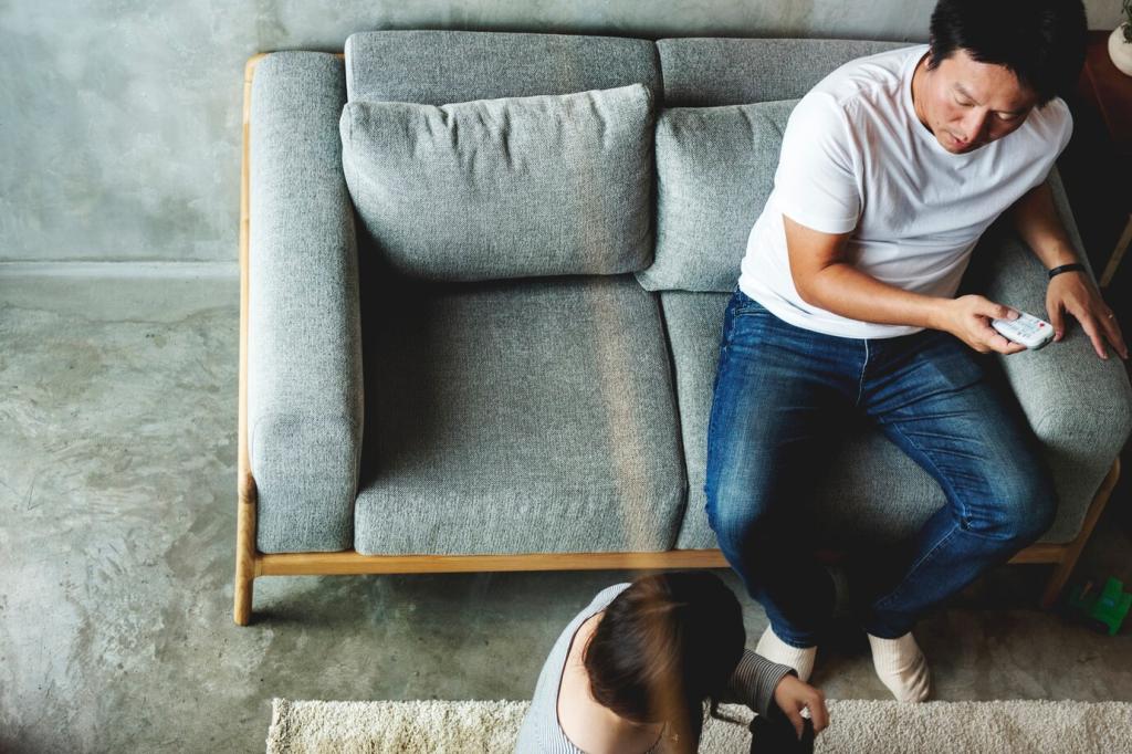 Sonneneinstrahlung lässt Farben verblassen und Fasern altern. Wählen Sie Stoffe mit guter Lichtbeständigkeit und planen Sie Vorhänge oder UV-Schutzfolien ein. Drehen Sie Kissen regelmäßig, damit Gebrauchsspuren gleichmäßig entstehen. Welche Raumseite ist bei Ihnen besonders sonnig?